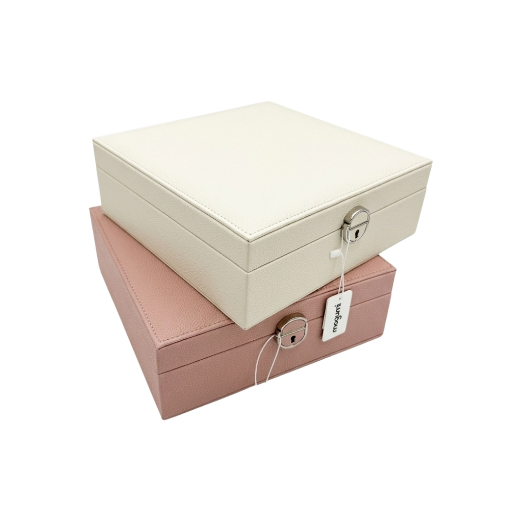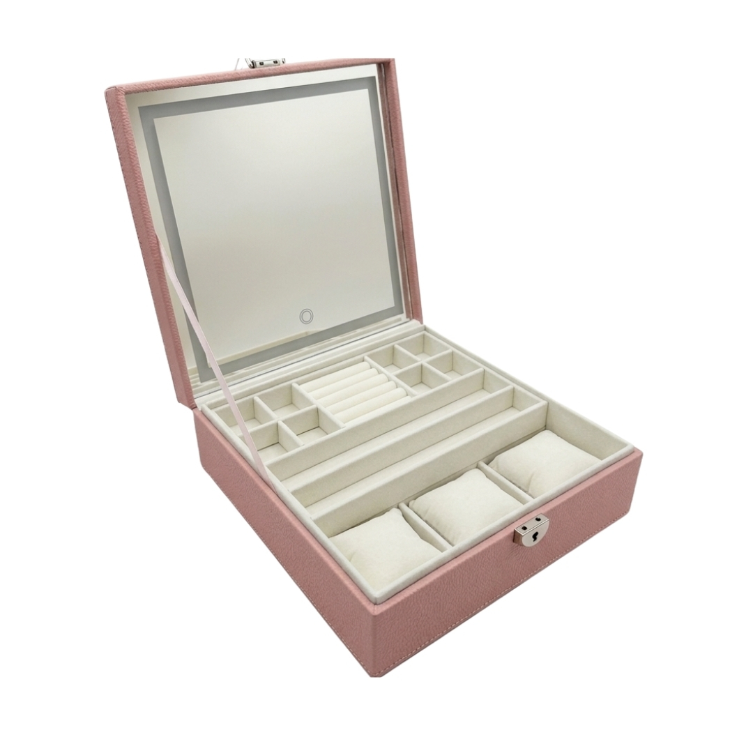 Alhajero con espejo y LED con luz fría y cálida, compartimentos para aros, collares, anillos, pulseras y cadenas, y espacio especial para relojes. Compacto, completo y listo para viajar con vos.