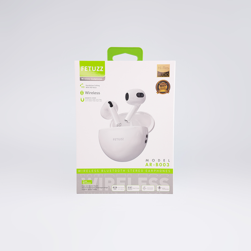 Auriculares inalámbricos FETUZZ modelo AR-B003, con sonido estéreo de alta calidad y tecnología Hi-Res Audio para una experiencia nítida y envolvente. Equipados con micrófono integrado para llamadas en alta definición (HD) y función manos libres. Su estuche de carga magnético asegura un almacenamiento seguro y recarga práctica. Con conectividad Bluetooth estable, son ideales para música, videollamadas o uso diario, combinando diseño ergonómico y rendimiento superior.